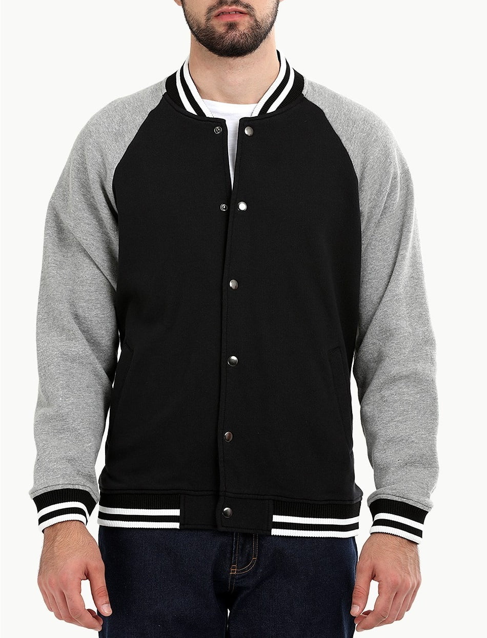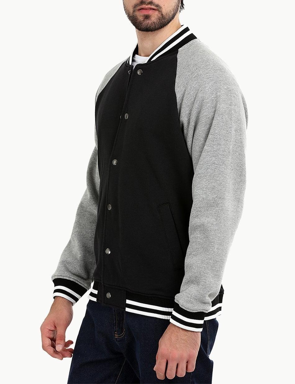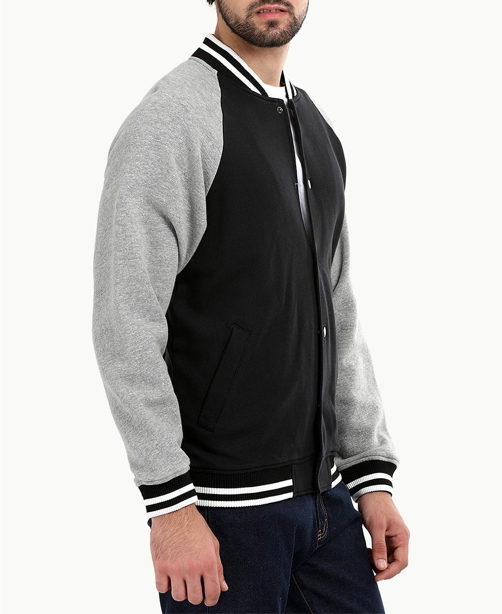 The young men are the ones who follow each and every fashion that enters the industry. Nowadays, things are evolving so fast that each month new fashion trend are introduced. One of the things that stays the same even in the days of evolution is the Men Varsity Bomber Jacket. It is a piece of comfortable yet trendy attire that every young man would love to have. Men Snap Button Varsity Jacket is black in color but its sleeves are made with gray colored fleece. From inside it is lined with soft viscose material. The university students love wearing such jackets so they are the best casual wear attire that they use quite often. It has full length sleeves that have ribbed cuffs, the collar of the jacket is also ribbed. So, if you want to feel good and look great, order one for yourself.