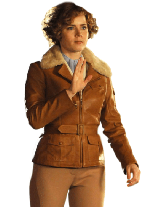 Amelia Earhart is a famous character played by the gorgeous actress Amy Adams in one of the most popular movies called Night at the Museum 2. In this movie, Amelia wore a number of beautiful attires that became very popular at the time the movie was released. Night at the Museum Amelia Earhart jacket is one of its kind. It is a brown color real leather jacket that is lined with inner viscose material. The collar of the lovely piece of attire is made of faux fur. This nicely shaped garment has a zippered closure. Amelia Earhart Night at the Museum Jacket has full-length sleeves with zippered cuffs. The pockets are situated in the upper part of both the sleeves. There is a pocket at the left side of the chest and two flapped pockets are there at the waist.