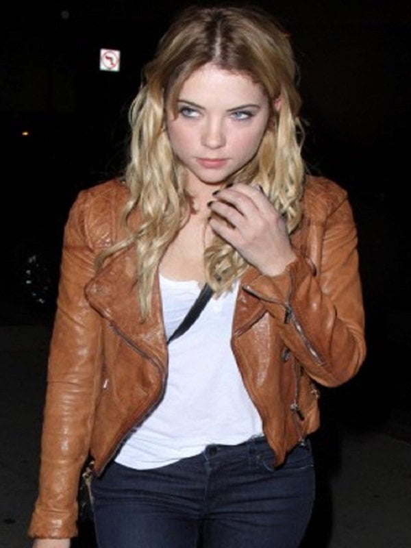 The full name of American actress Ashley Benson is Ashley Victoria Benson she is not only an actress but a model and a singer too. She has a huge fan following and people follow her for her skills as well as her attire. The star celebrity Ashely Benson was once seen by her fans wearing a trendy and elegant jacket that many ladies would love to buy. It is a brown colored jacket made of genuine leather. Ashley Benson Elegant Design Jacket has a lapel style collar and is lined with soft viscose lining. It has full-length sleeves with zipper cuffs. Two zipper pockets are situated at its waist and one inner pocket is provided for convenient storage of precious belongings like credit cards.