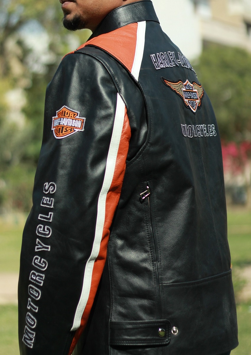 Most bikers from all over the world know this fact Harley Davidson is the name of an American-based company that specialized in making motorcycles. Harley Davidson Motorcycle Riding Jacket is a trendy biker jacket made in combination of two different colors. The base of the jacket is that of real leather in black color and the patches attached to it are made of red color. The lining of the jacket is done with soft viscose material. The smart jacket has two zipper pockets at the waist and has a snap tab-style rounded collar. It is a full sleeves outerwear with zipper cuffs. On the chest of the jacket is written Harley Davidson and all other text and patch designs are printed on the sleeves.