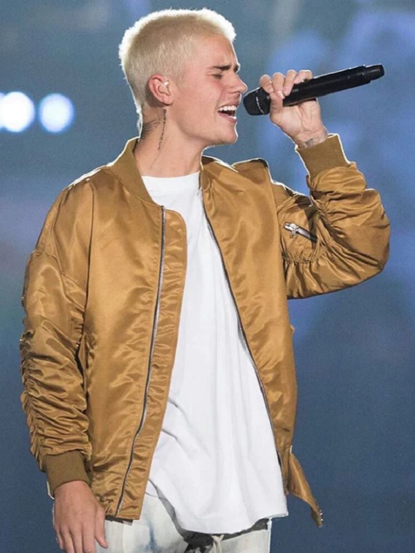 Justin Bieber is a world-renowned Canadian singer who is known for his melodious tunes and awesome songs. In one of his public appearances, he was noticed by the fans wearing a spring bomber jacket in the beautiful color of golden brown. The jacket is made of satin material and is lined with soft viscose. The jacket is designed with a zipper in the front for closure. The stylish and trendy Justin Bieber Spring Bomber jacket has a ribbed collar and there are full-length sleeves that are guarded by ribbed cuffs. The smart piece of attire has two pockets at the waist and one inner pocket. The apparel industry has redesigned the jacket in such a way that nobody can find the differences that are deliberately left to avoid copyright issues.